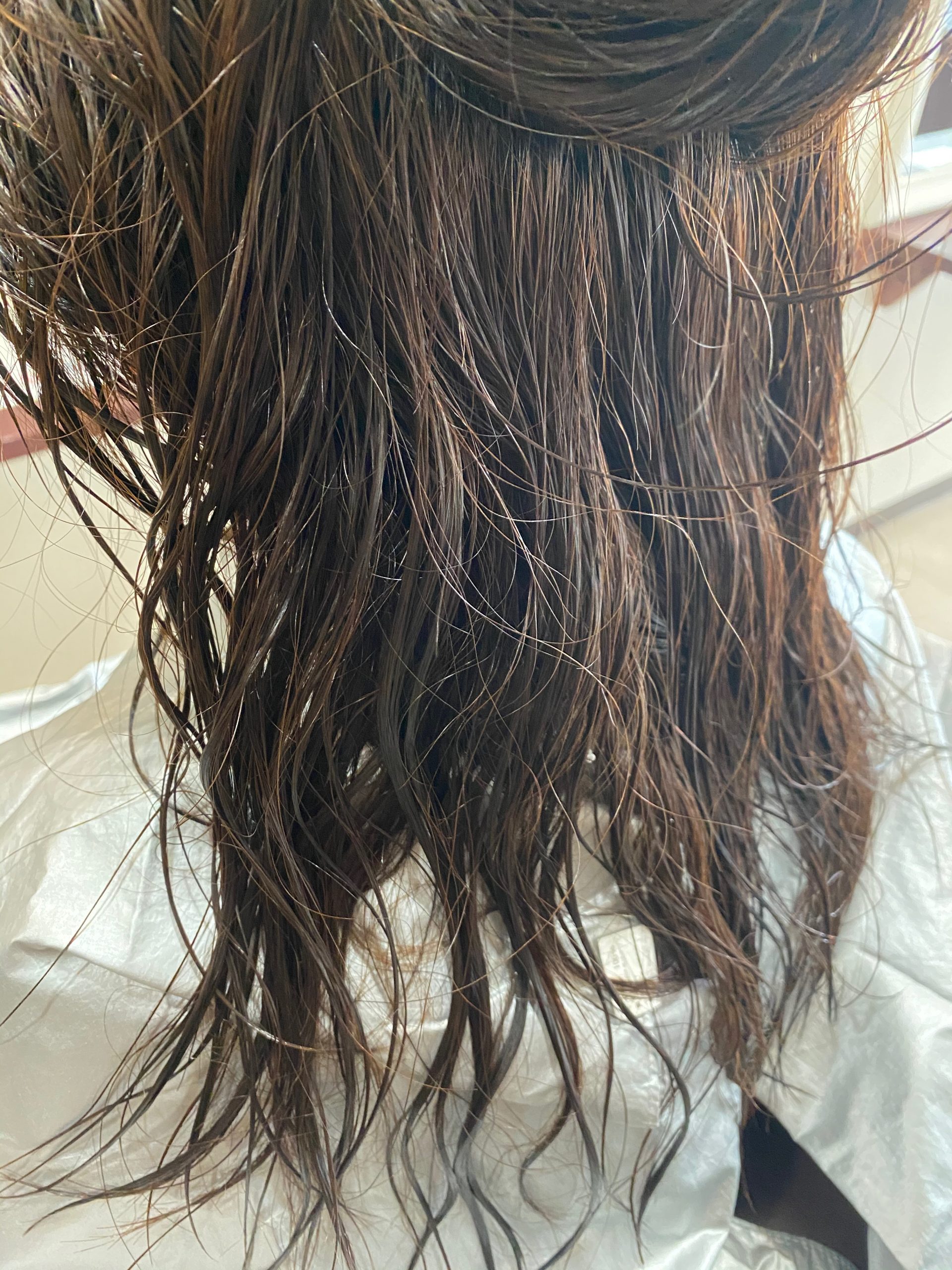 毛先の10センチ程度以前の縮毛矯正が残っており、 ウェーブバック(くせが戻っている状態)しております。