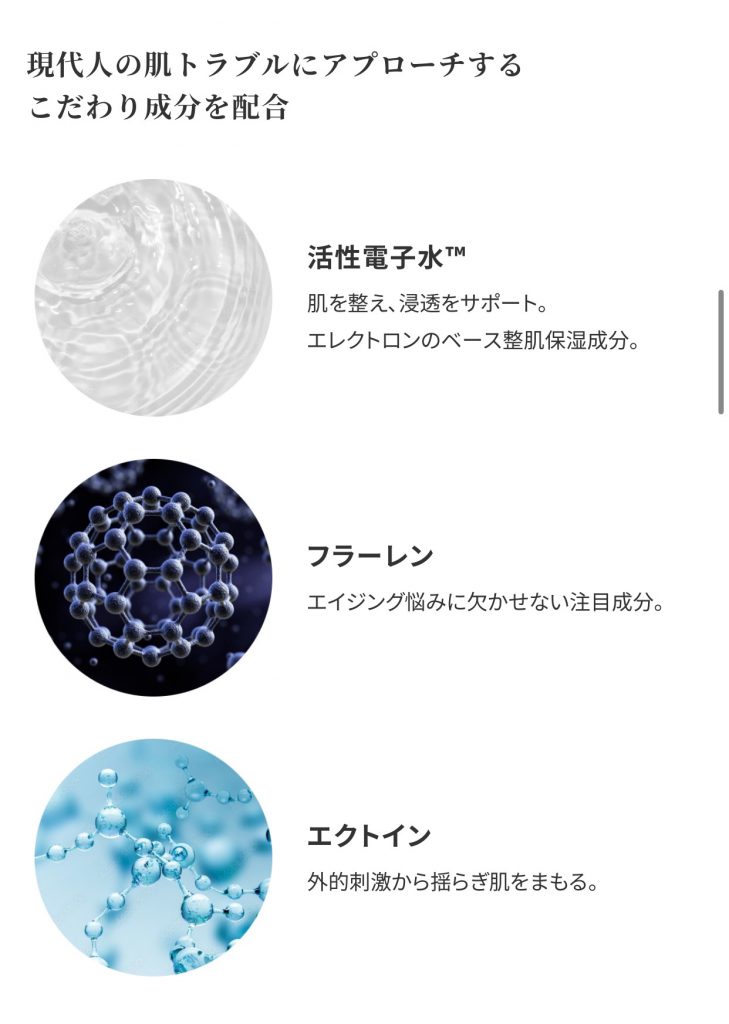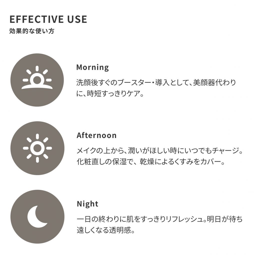独自の活性電子水をベースに厳選されたハリ成分をふんだんに配合したアイテムです。すべての肌ケアの始まりに使用することで、まるで美顔器のようなハリアップ効果とともに肌を整えます。洗顔後すぐのまっさらな肌には、ブースターとして。乾燥やくすみ( 乾燥による)が気になるときには、保湿液として。素肌にもメイクの上からも、いつでもどこでも使用可能です。スプレーと同時に、みずみずしいミストが肌を包み込み、スピーディにリフレッシュ。明るさや透明感、引き締まり感をもたらし、次のスキンケアの働きを高めます。 やわらかなミストで