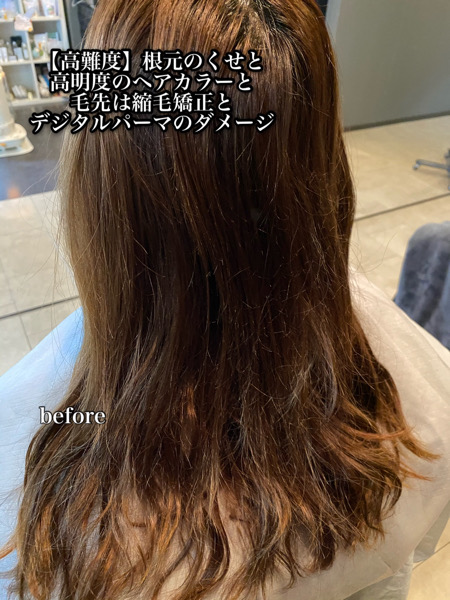 今回は、 根元が伸びて縮毛矯正と 以前の縮毛矯正とデジタルパーマ 他店での 高明度のヘアカラーによるダメージ