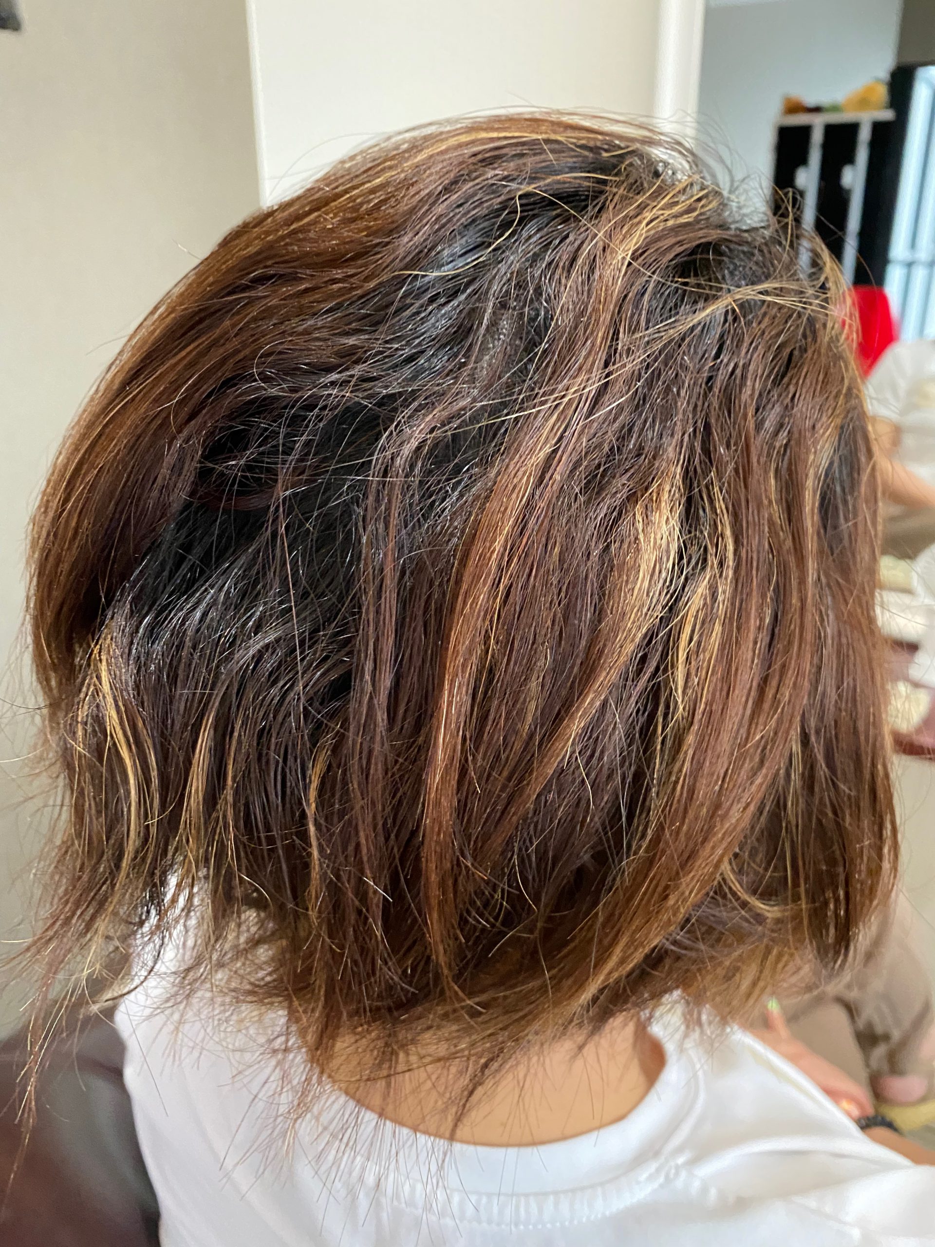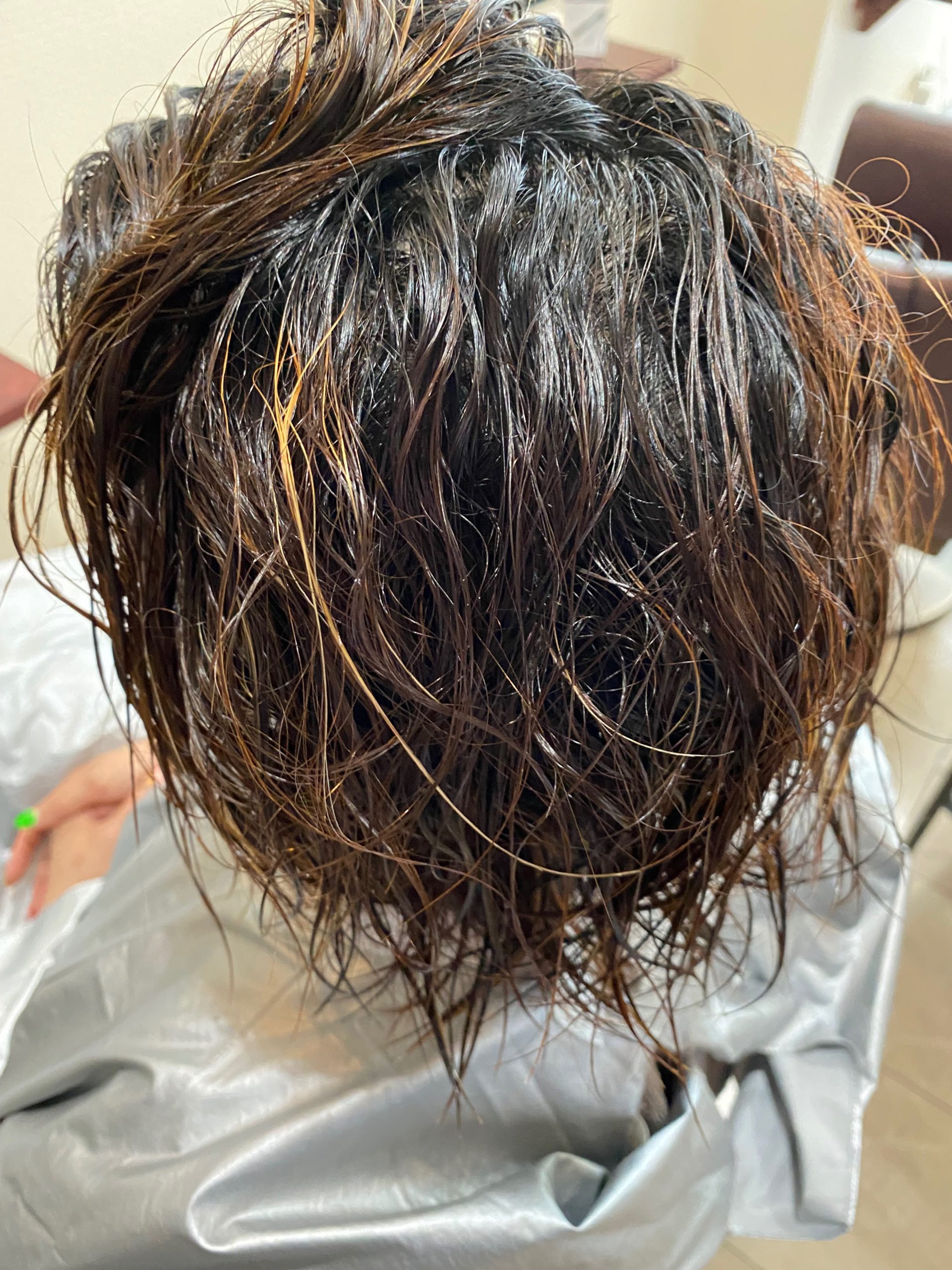 【 before 】 乾いている髪の状態で、 明るめのヘアカラーとブリーチを伴った ハイライトが確認していただけると思います。 髪のくせの状態といえば、 根元にうねりが出ています。