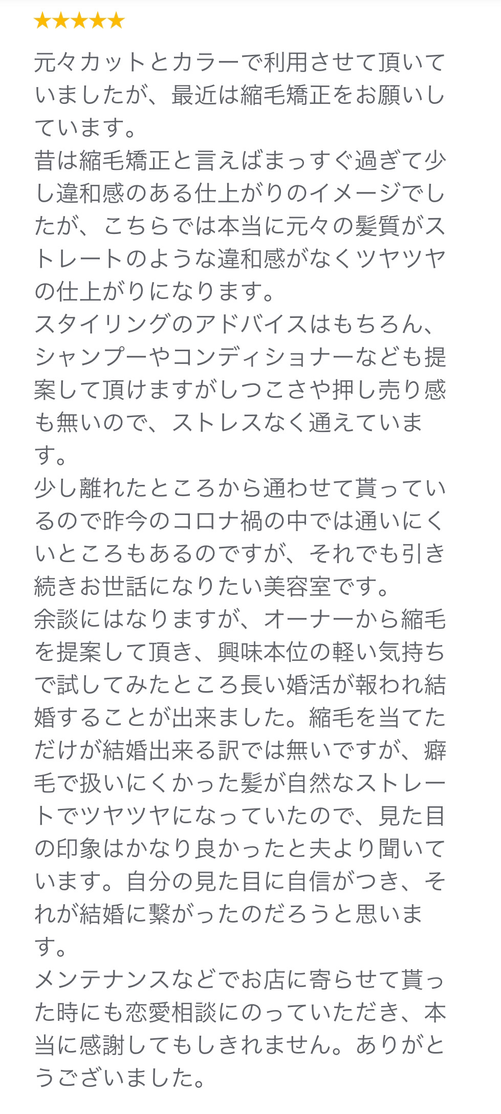 元々カットカラーで利用させていただいていましたが、最近は縮毛矯正をお願いしています。 昔は縮毛矯正と言えばまっすぐ過ぎて少し違和感のある仕上がりのイメージでしたが、こいらでは本当に元々の髪質がストレートのような違和感がなくツヤツヤの仕上がりになります。 スタイリングのアドバイスはもちろん、シャンプーやコンディショナーなどの提案して頂けますがしつこさや押し売り感も無いので、ストレスなく通えています。 少し離れたところから通わせて貰っているので昨今のコロナ禍の中では通いにくいところもあるのですが、それでも引き続きお世話になりたい美容室です。 余談には、なりますが、オーナーから縮毛矯正の提案を頂き、興味本位の軽い気持ちで試してみたところ長い婚活が報われ結婚することが出来ました。縮毛を当てただけが結婚出来る訳では無いですが、癖毛で扱いにくかった髪が自然なストレートでツヤツヤになっていたので、見た目の印象はかなり良かったと夫より聞いています。自分の見た目に自信がつき、それが結婚に繋がったのだろうと思います。 メンテナンスなどでお店に寄らせて貰った時にも恋愛相談にのっていただき、本当に感謝してもしきれません。ありがとうございました。