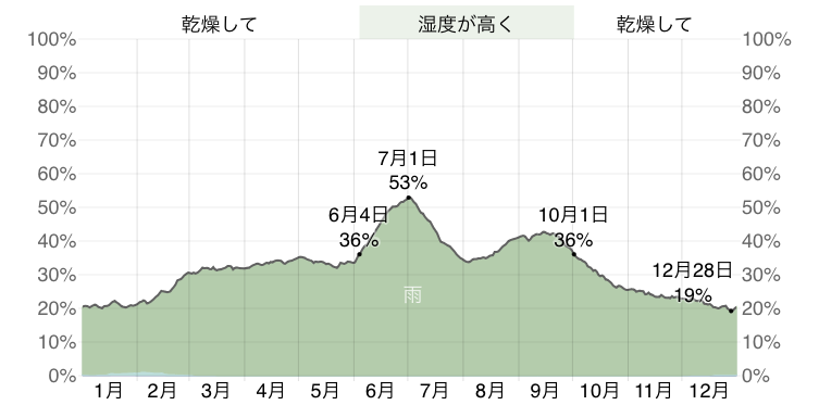 3月から上昇しているのがわかると思います。少しづづ雨の影響が強くなってきます。