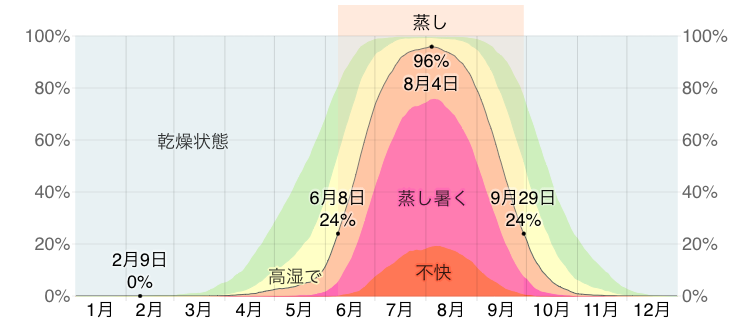 続いては、大阪市における湿度快適性レベルを見ていきましょう。3月から8月4日のピークを迎え、11月末までグラフの波は続きます。